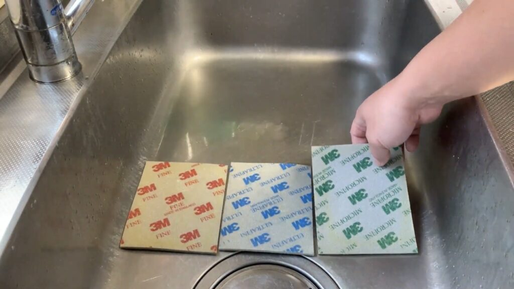 今回使用するのは、以前「ステンレスシンクの鏡面磨き」でもご紹介した、3種類の研磨スポンジです。