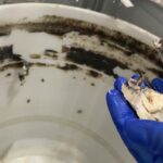 分解した洗濯槽の裏側には、10年分の洗剤カス、ヌメリ、黒カビがびっしりと付着しています [06:25]。市販の洗濯槽クリーナーでは落としきれない「固形化した汚れ」は、直接ブラシで擦り洗いするのが一番効果的です。