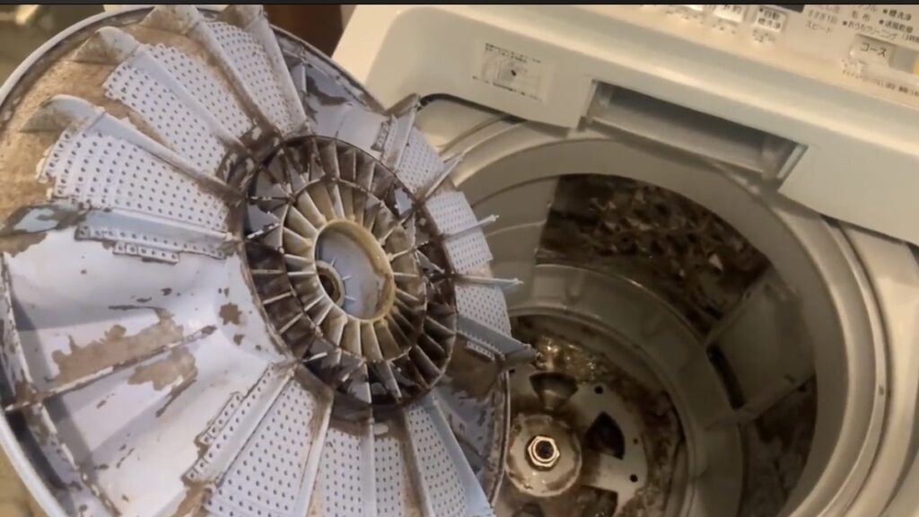 動画のように洗剤カスが層になっている場合、市販のクリーナーで中途半端に汚れを浮かせてしまうと、その後何度洗濯しても「黒いカス」が出続ける泥沼状態になることがあります。2〜3回クリーナーを試してもカスが止まらない場合は、物理的に除去する分解清掃を検討してください。