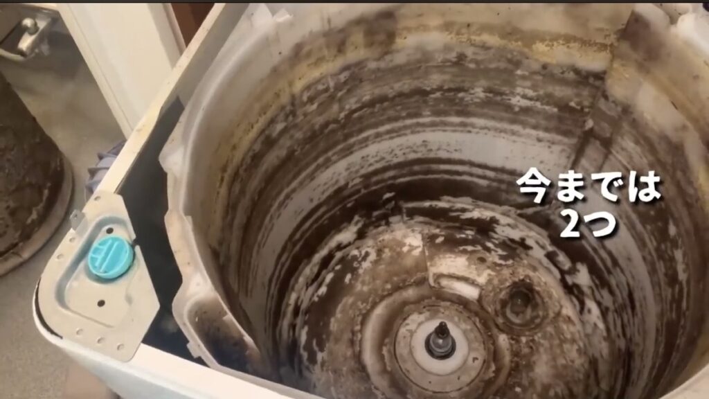 さらに驚くべきは、「定期的に洗濯槽クリーナーを使っているのに、汚れが全く剥がれ落ちていない」という事実です 。通常、クリーナーを使えば水面の高さまでの汚れはある程度落ちるものですが、今回のケースでは洗剤成分が「層」のように固まり、カビをガッチリとガードしてしまっていました。