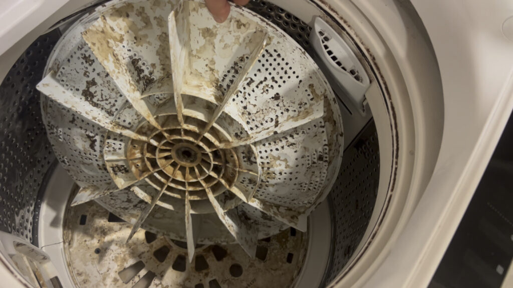 洗濯槽の裏側の分厚いカビの層は、まず物理的に剥がし落とす作業から始まります。